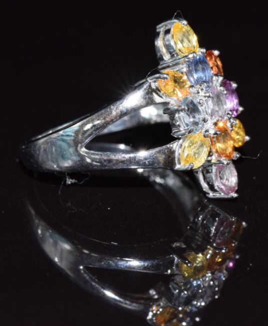 A 9k white gold ring set with multi-coloured sapphires, 4.7g, size M