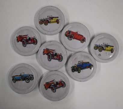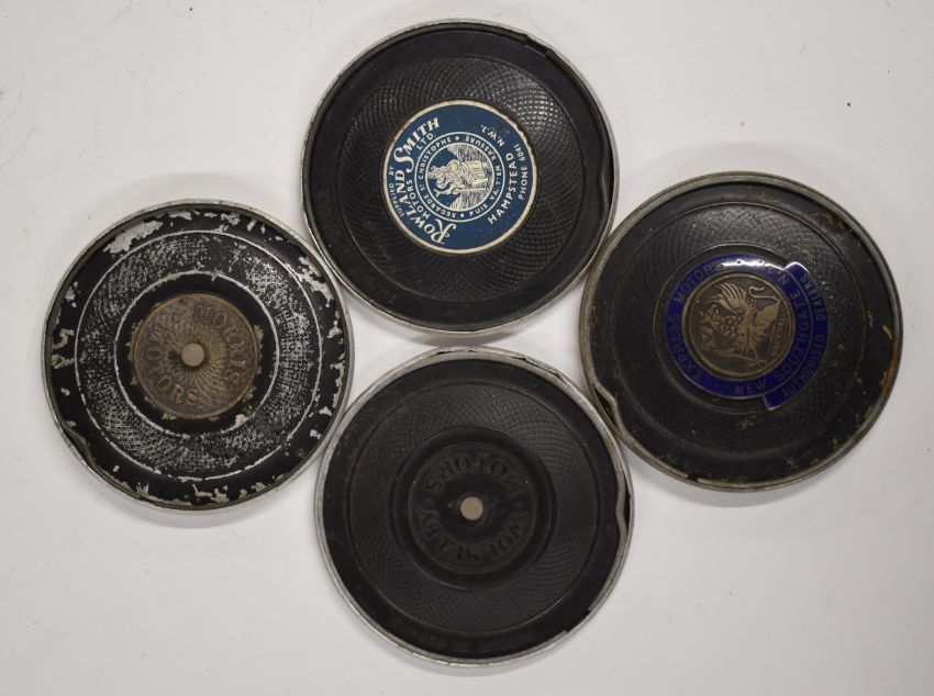 Motoring collectables to include four car tax disc holders including Express Motors, New Southgate, N11 Vauxhall, Morris and Wolseley, Armstrong Siddeley Owners Club and Rover Owners Association badges and jar lids