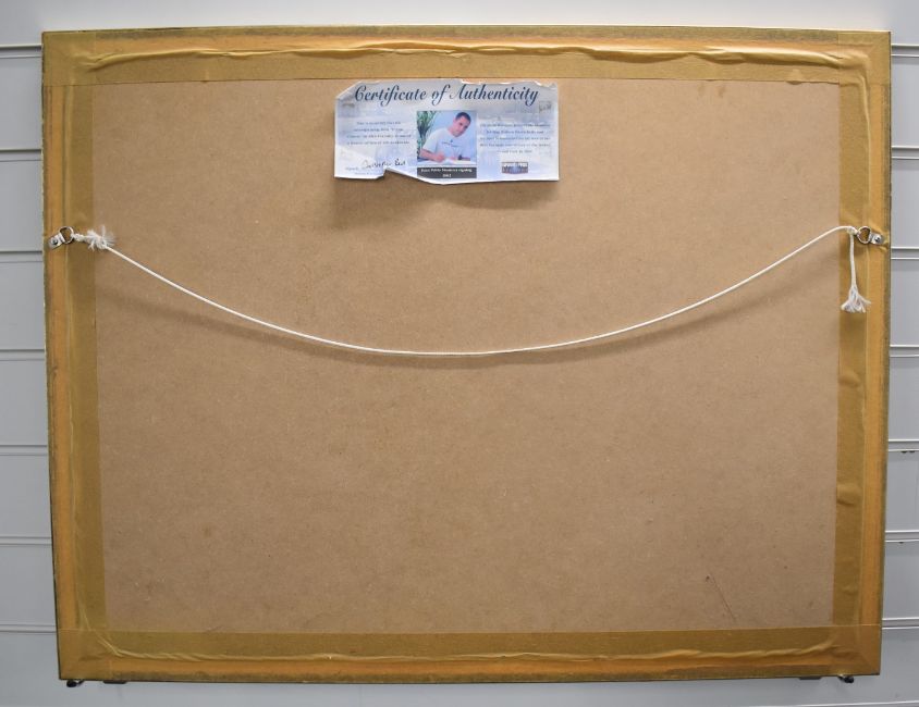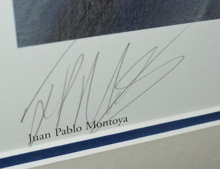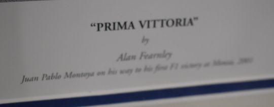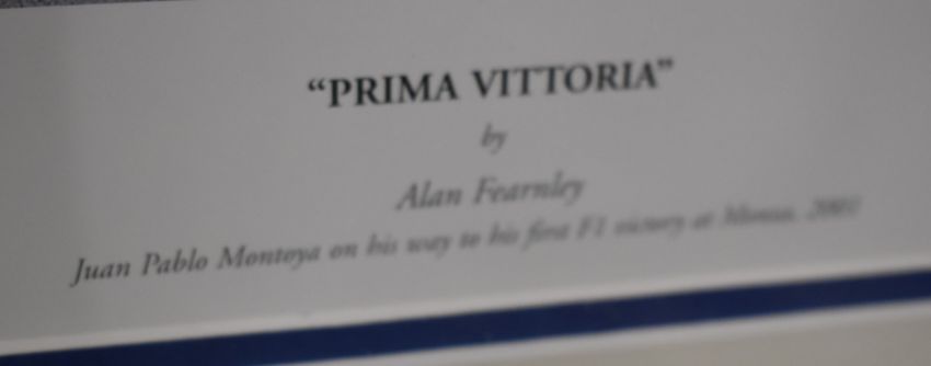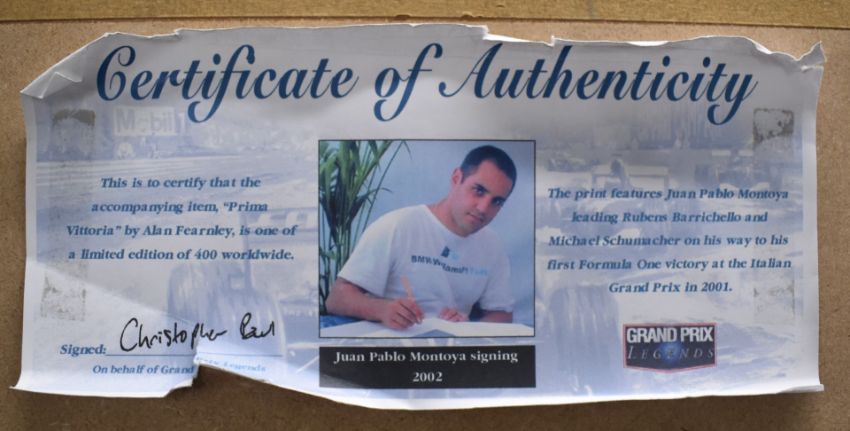 Alan Fearnley signed limited edition (214/400) print 'Prima Vittoria' Monza F1 2001, also signed by driver Montoya, 46 x 65cm