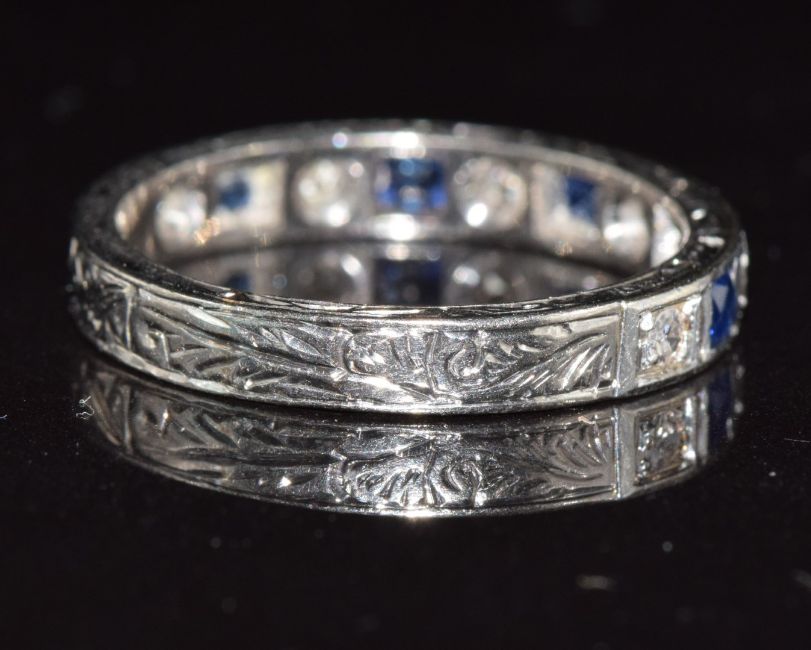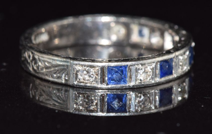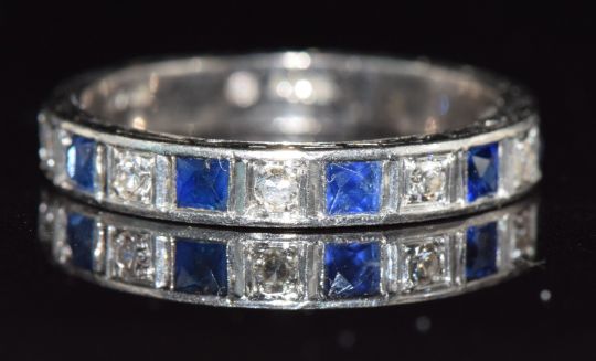 Art Deco 18ct white gold half eternity ring set with square cut sapphires and round transitional cut diamonds, 4.9g, size O