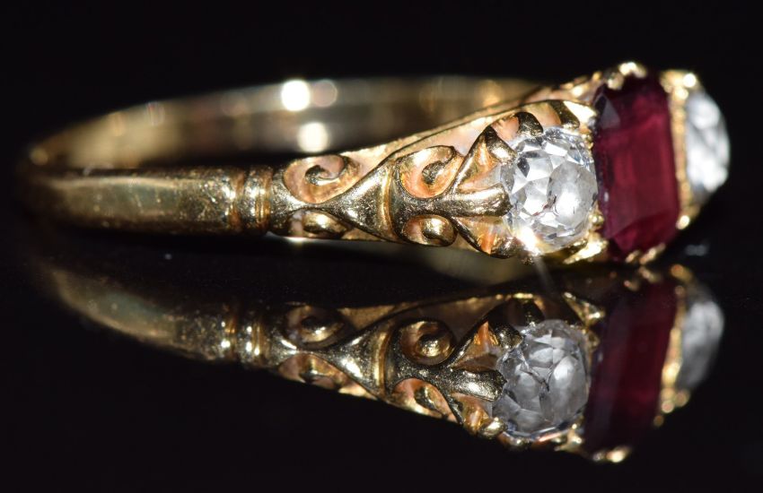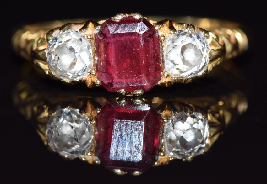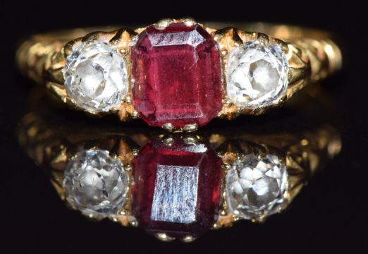 Victorian 18ct gold ring set with an emerald cut garnet and two old cut diamonds each measuring 0.15ct, 2.6g, size K