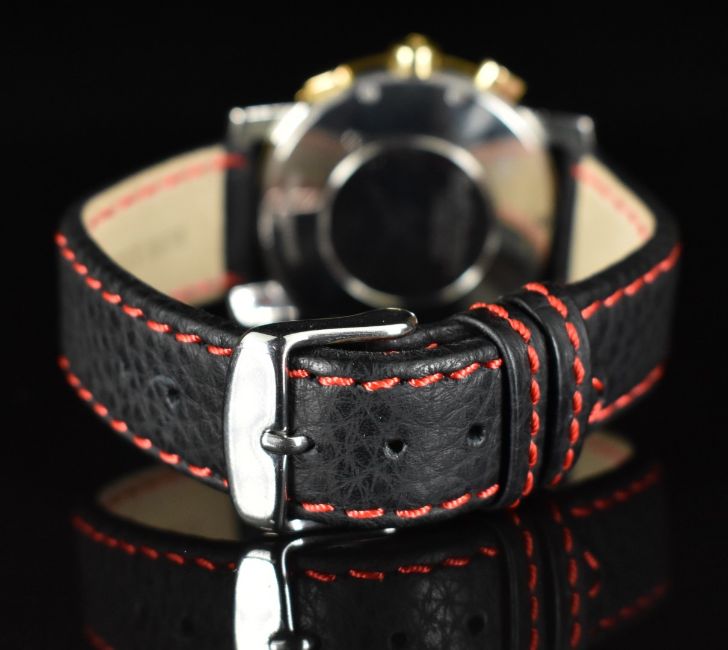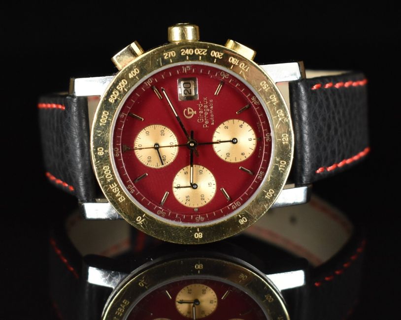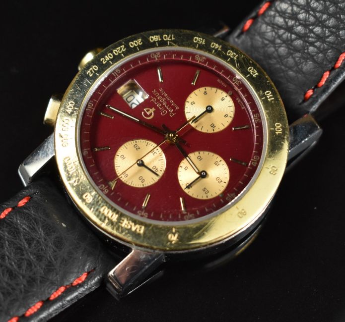 Girard Perregaux gentleman's automatic chronograph wristwatch ref. 7000 GBM with date aperture, gold hour markers, subsidiary dials, crown, pushers and bezel, burgundy dial, stainless steel case and signed calibre 800 064 movement, on black leather strap with red stitching, case diameter 38mm, serial number B-3554.