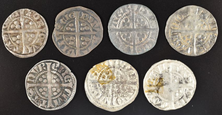 Seven Edward I hammered pennies, various mints Lincoln class 3f, Newcastle class 3c, Durham (Bishop de Insula) London 4a, Bristol 2b, Bury St Edmunds 10c and Canterbury 10c (all F)