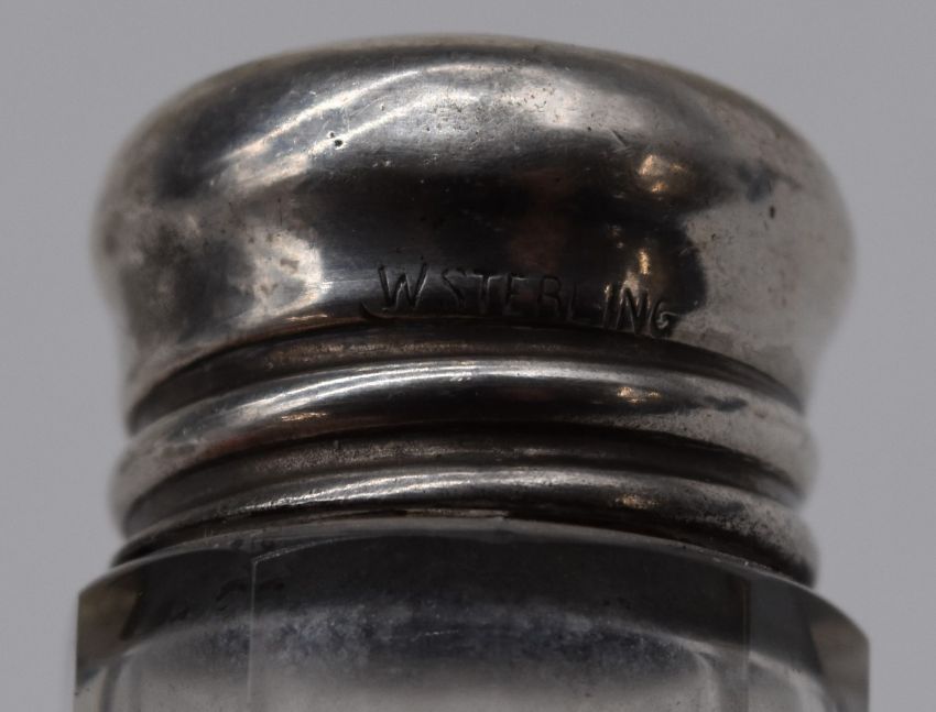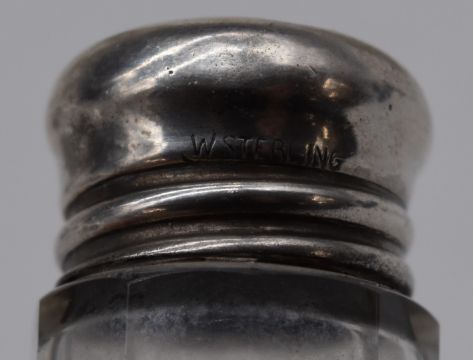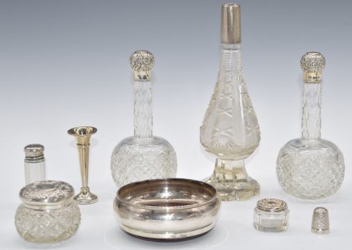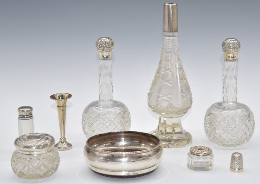 Hallmarked silver mounted items comprising wine coaster, diameter 10.5cm, Birmingham 1987, small trumpet vase, six cut glass silver topped items and a silver plated thimble