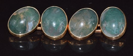 A pair of 9ct gold cufflinks set with moss agate cabochon, in original Liberty box, 11.7g