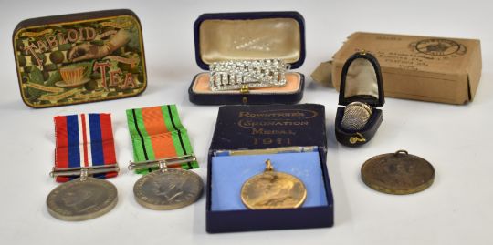 Pair of WW2 medals with name to box Mrs L Rickatson, cased hallmarked silver thimble, tabloid tea tin, Rowntree's 1911 Coronation medal