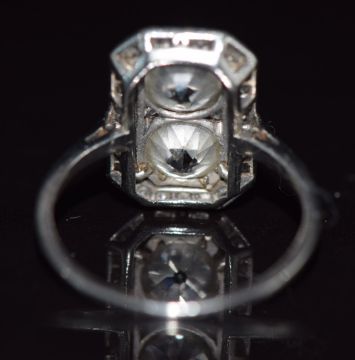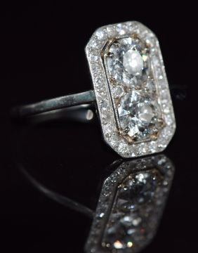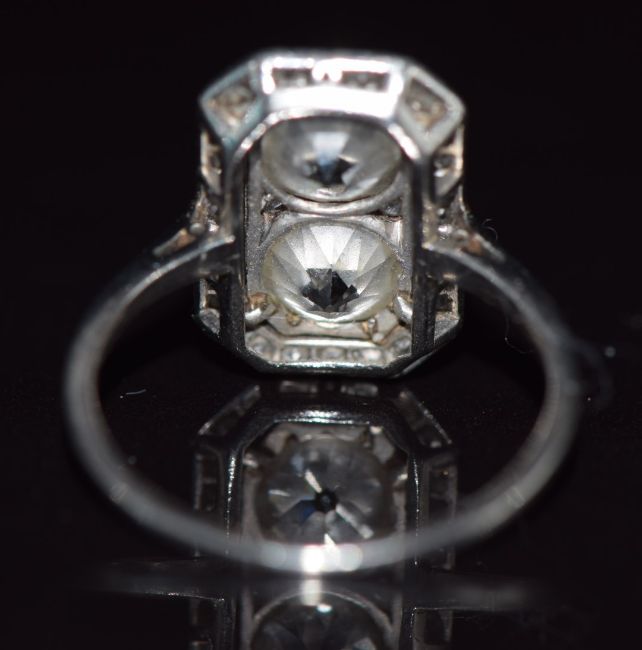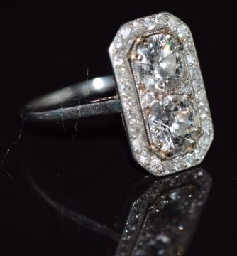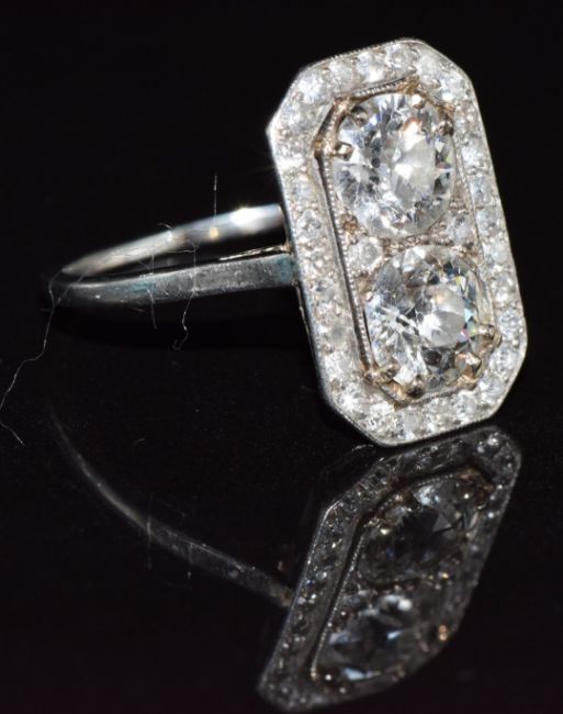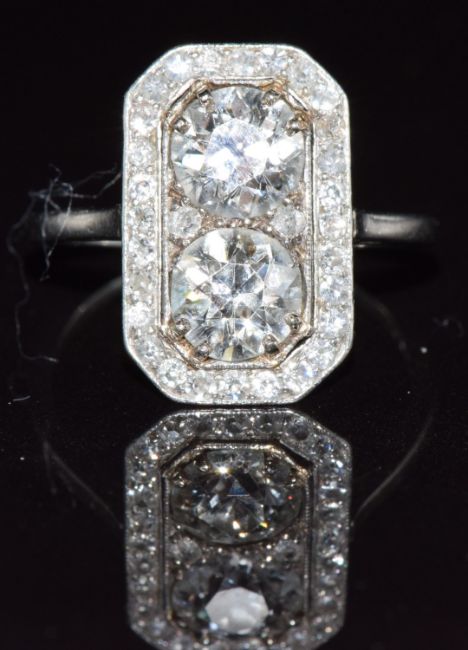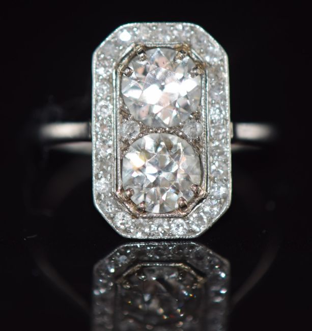 Art Deco platinum ring set with old round cut diamonds of approximately 1.02ct and 0.94ct, within a border pavé set with 28 diamonds and with two rose cut diamonds between the two centre stones, 4.1g, size P