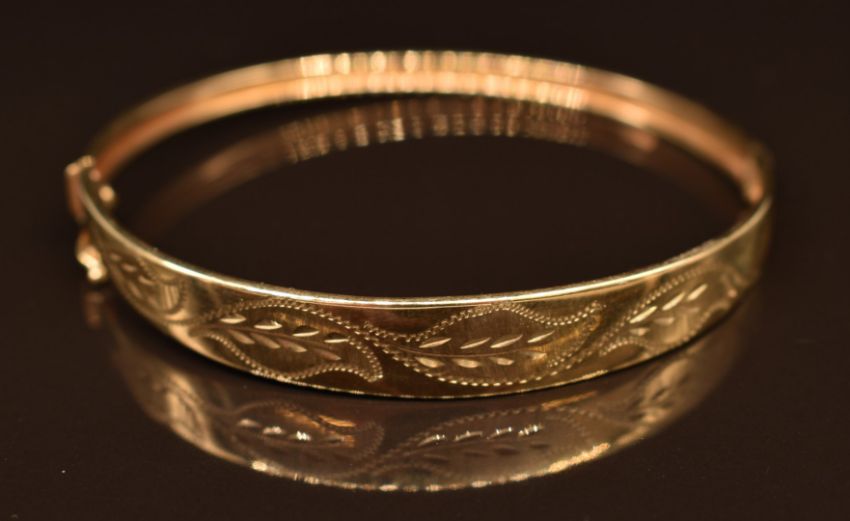 A 9ct gold bangle with foliate decoration, 6.5g, 6 x 5.5cm