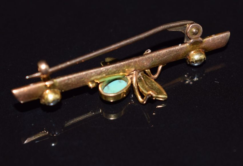 Edwardian brooch in the form of a fly set with turquoise, seed pearls and a ruby, 2.3g, 4cm