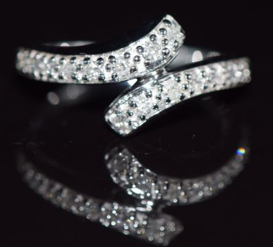 A 9k while gold ring set with diamonds in a twist setting totalling approximately 0.2ct, 3.4g, size N