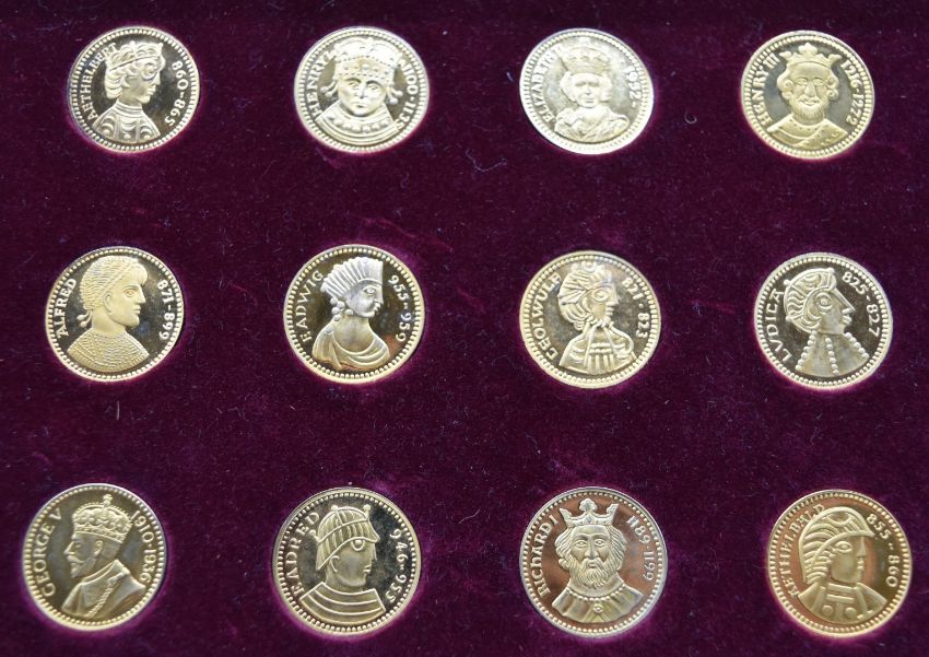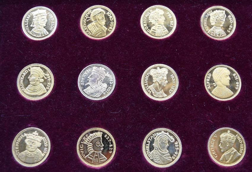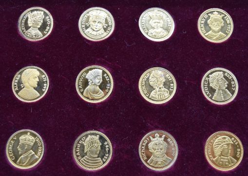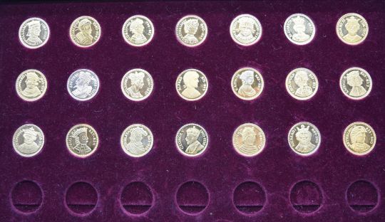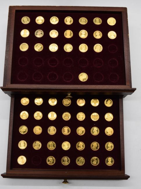 'Our Royal Sovereigns' collection of fifty six coins from Danbury Mint, in wooden collector's cabinet