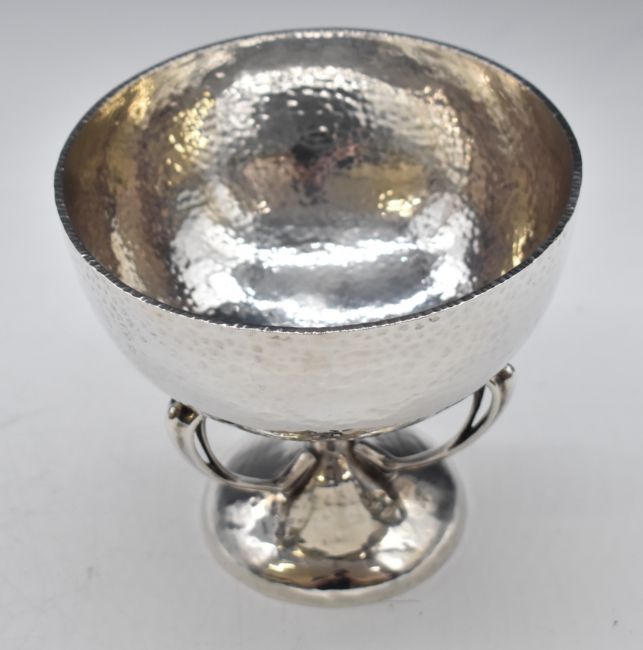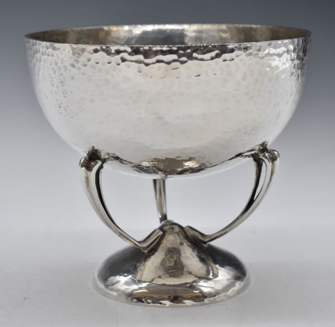 A hallmarked Scottish silver Arts and Crafts hammered pedestal bowl, Edinburgh 1904 maker Hamilton & Inches, 13.5cm tall, 15cm diameter, 389g