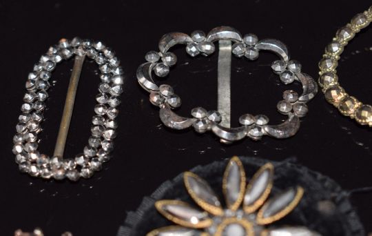 A collection of Victorian cut steel buckles, miser purse and brooch