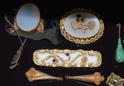 Victorian/ pinchbeck brooches and bracelet, Victorian intaglio seal, carved citrine seal and sections of Victorian earrings