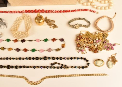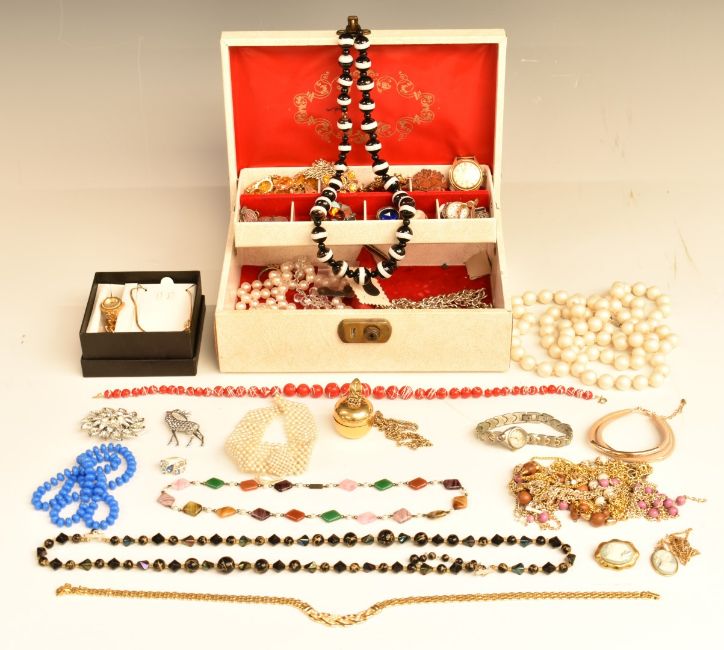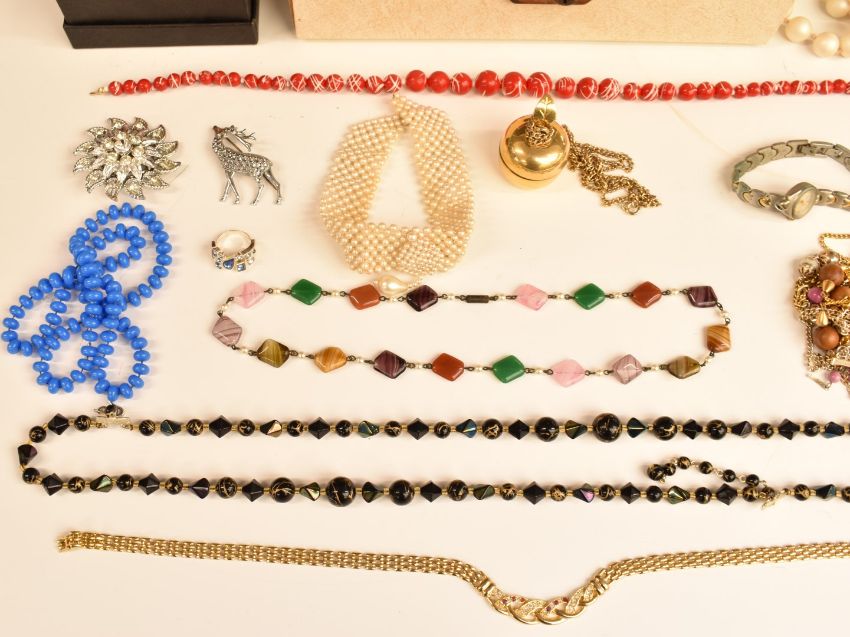 A collection of jewellery including Victorian banded agate necklace, Miracle brooch, Art Deco necklace, beads, brooches, threepenny brooch etc