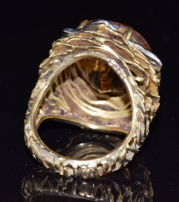 A 1970's 18ct gold ring, the mount made up of layers of pierced gold set with a large mixed oval cut citrine and round cut diamonds, 18.6g, size M