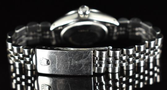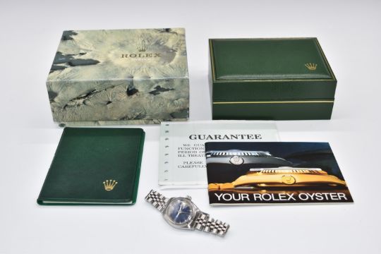 Rolex Oyster Perpetual Date ladies automatic wristwatch ref. 6919 with date aperture, luminous silver hands and hour markers, blue dial, stainless steel case and signed movement, on stainless steel bracelet, case diameter 26mm, serial number 5091614, in travel pouch.