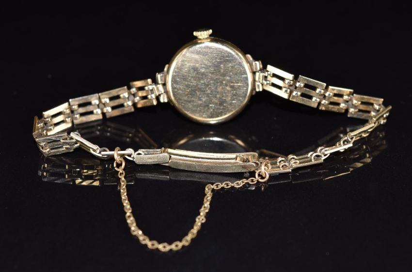 Rotary 9ct gold ladies wristwatch with blued hands, Arabic numerals, silver dial and 21 jewel movement, on 9ct gold expanding bracelet, case diameter 19mm, serial number 8042, 15g.