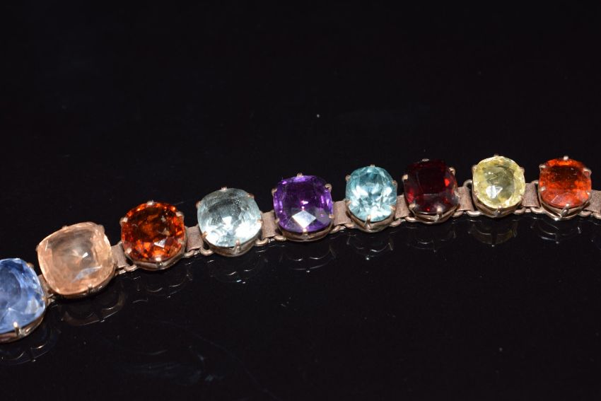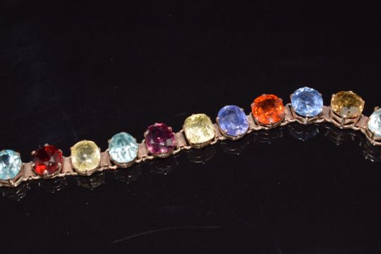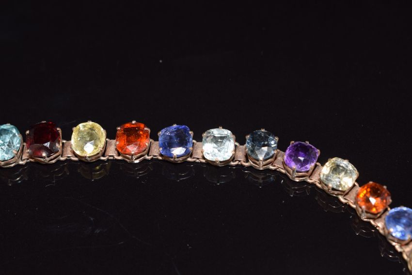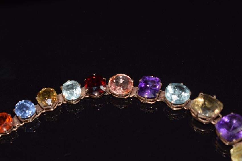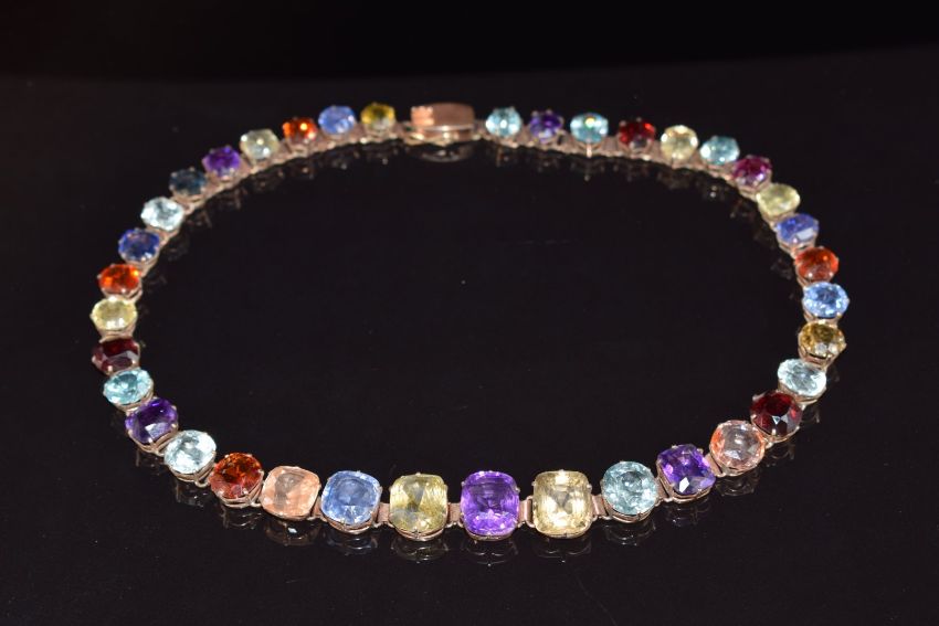A c1900 rose gold necklace set with twelve natural Ceylon sapphires, the largest yellow 7ct and the largest blue 5ct, garnet, citrine, amethyst, zircons and quartz, 38.7g, 38cm long