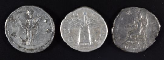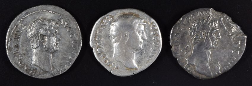 Roman Imperial coinage Adoptive Emperors Ad96-138 Hadrian three silver Denarius includes obv. Hadrianus AVG S IIIVI bare head right, rev. ASIA Asia standing left on prow holding acrostilium and oar, diameter 18mm, 2.5g together with two further examples including Justitia and Modius reverses