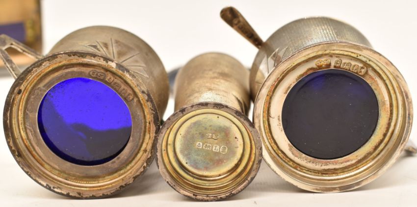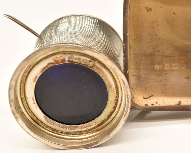 Hallmarked silver items to include cigarette case, Art Deco cruet set and a brooch marked sterling, weight without blue glass liners 165g