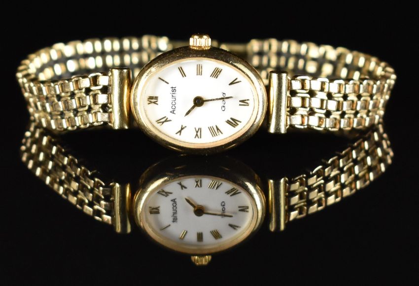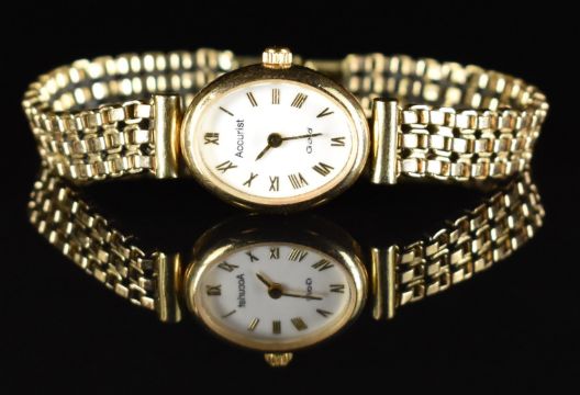 Accurist 9ct gold ladies wristwatch with gold hands and Roman numerals, white dial and quartz movement, on 9ct gold bracelet, case diameter 15mm, 15.5g.