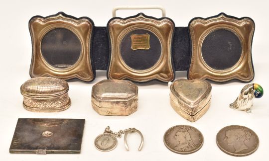 Hallmarked silver triple photograph frame, overall length 22.5cm, two Victorian coins, three unmarked white metal pots, novelty white metal and enamel duck etc