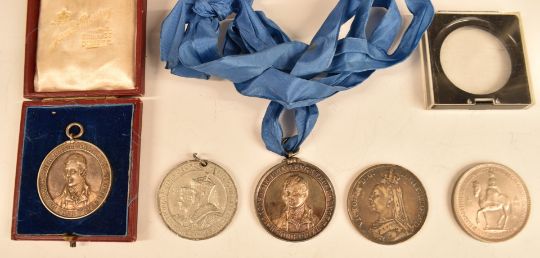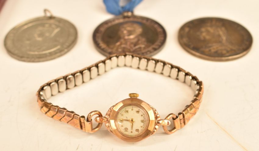 A 9ct gold ladies watch, silver crown, two silver Dundee school medallions etc