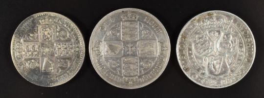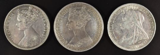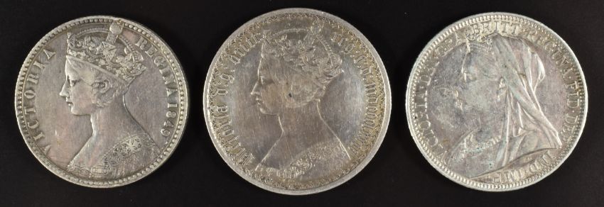 Three Victorian florins comprising a godless 1849, Seaby 3890 (NVF), a Gothic type B3, Seaby 3893 (GF) and an 1899 veiled head example (VF)