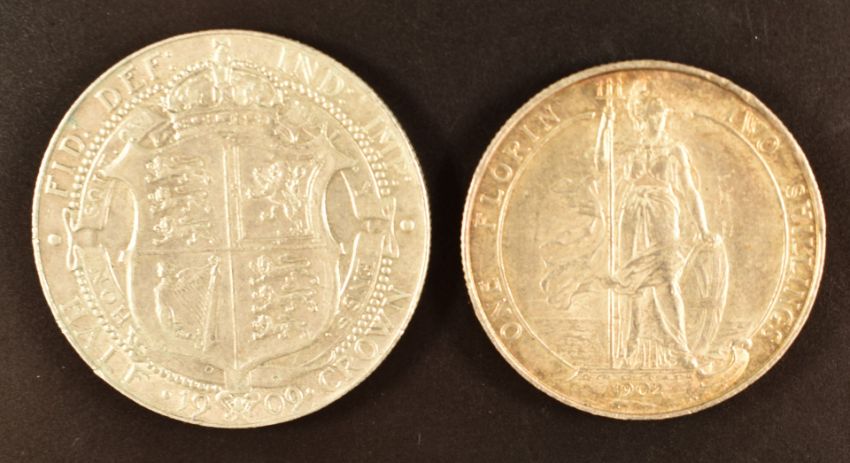 Edward VII 1902 florin, VF-EF, together with a 1909 half crown, VF