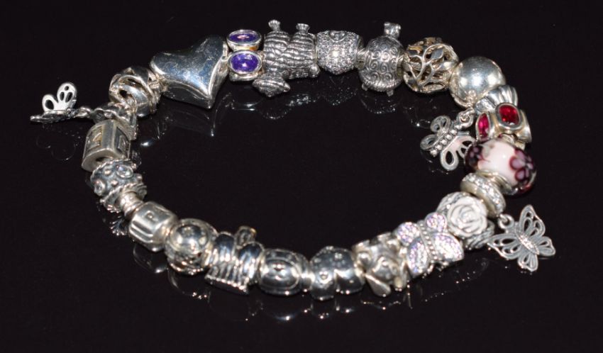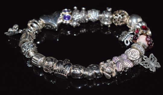 Pandora silver bracelet with over twenty Pandora silver charms including sheep, butterfly, dog, rabbit, angel, turtle, etc