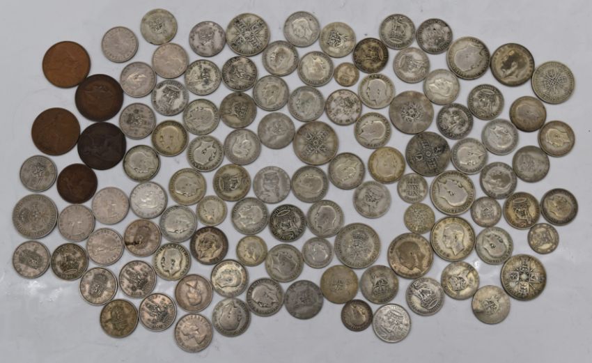 A collection of pre decimal UK coinage, includes approximately 550g of pre 1947 silver coinage