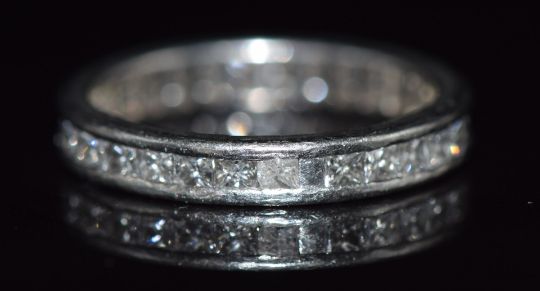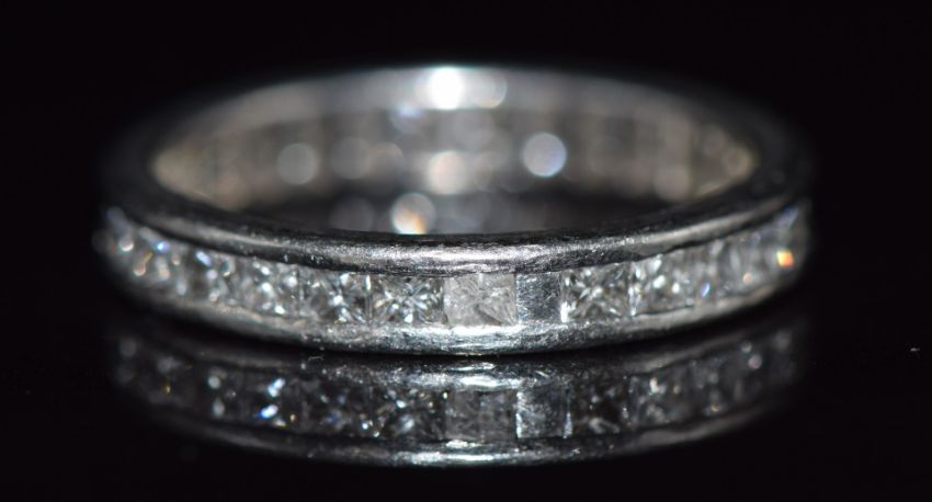 An 18ct white gold eternity ring set with thirty princess cut diamonds totalling approximately 1.5ct, 4g, size K