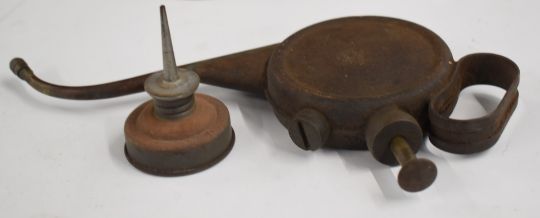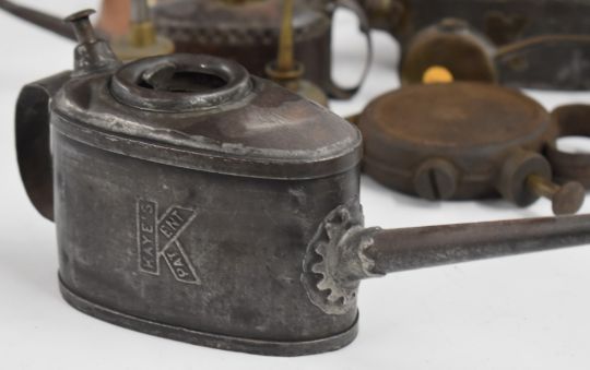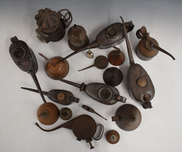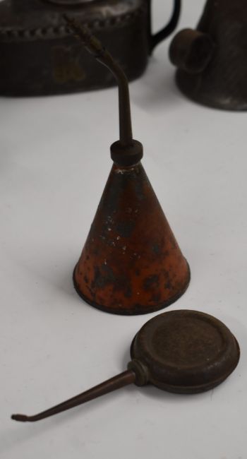 Vintage oil cans including Kaye's and Wesco together with a police or similar hand lamp etc