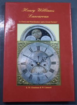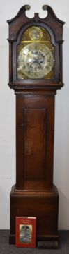 Henry Williams of Lancarvan (1727-1790) Welsh 18thC 8 day longcase clock, the 12inch brass dial with Roman numerals signed to silvered centre, with secondary minute dial and date aperture, foliate brass spandrels featuring bees and dolphin decoration to arch with 'Tempus Fugit' phoenix brass insert. The plain oak case with turn buckle latch to door, raised on bracket feet, the arched hood with plain pillars and swan neck pediments, 72" tall, together with a limited edition book about the clock maker by Cloutman and Linnard, this clock is known to the authors as 'The Missing Clock'