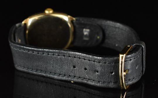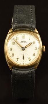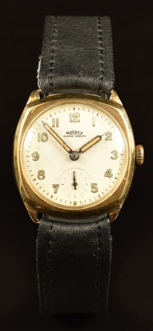 Rotary Super-Sports 9ct gold gentleman's wristwatch with inset subsidiary seconds dial, luminous blued hands, Arabic numerals, cream dial and cushion shaped case, on black leather strap, case dimeter 29mm, serial number 72238.
