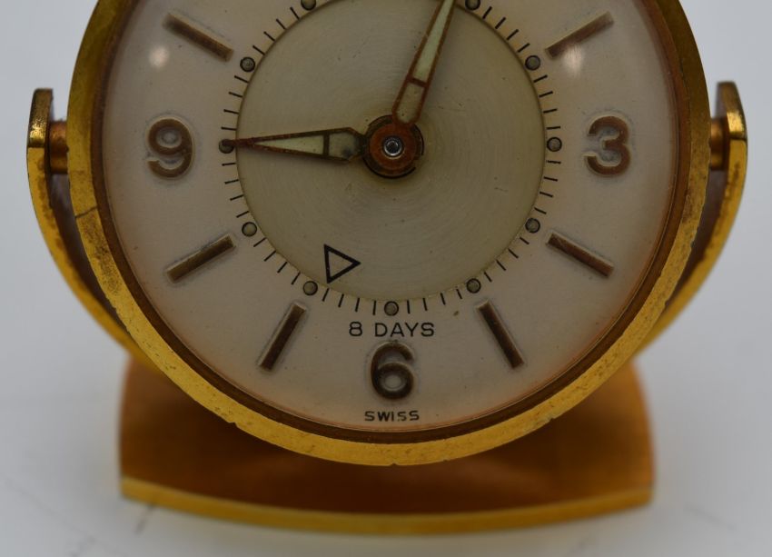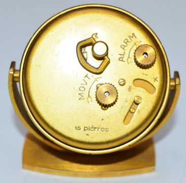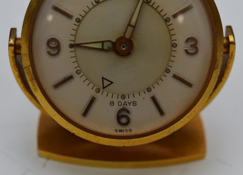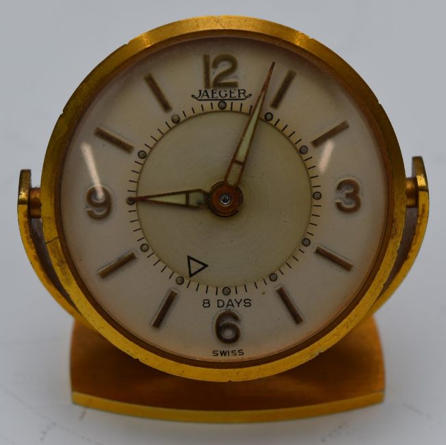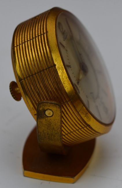 Jaeger (LeCoultre) travelling desk or alarm clock with luminous hands, gold hour markers, cream dial and gilt case and stand, case diameter 46mm.