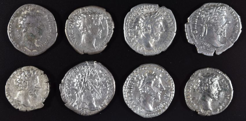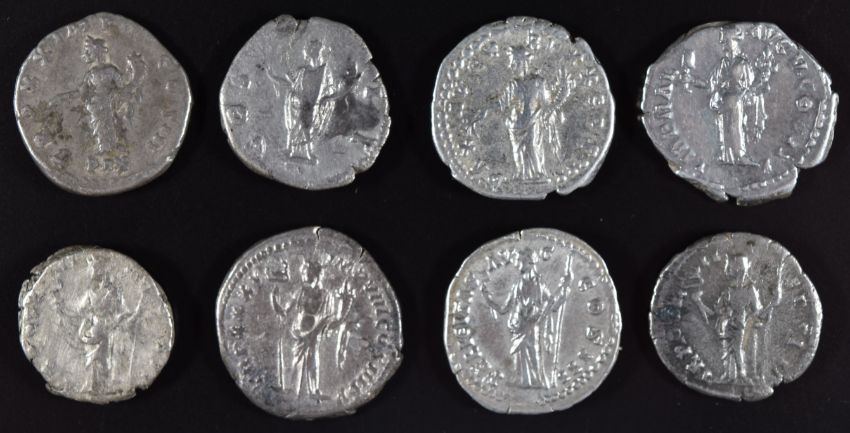 Roman Imperial coinage The Antonines AD138-193 Marcus Aurelius eight silver Denarius, various reverses, diameter 17-19mm