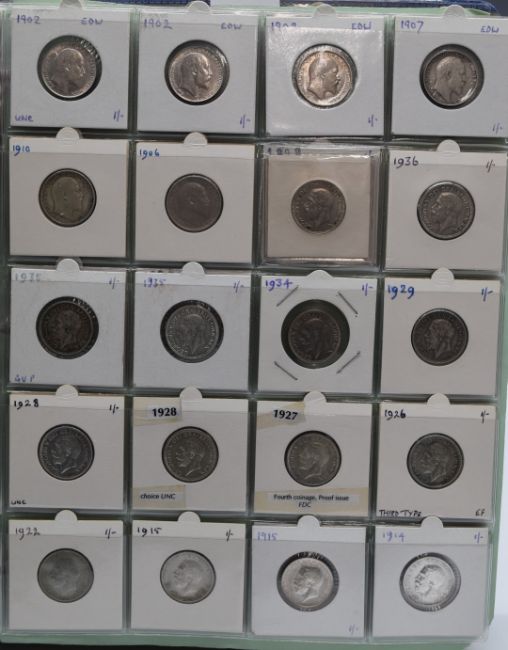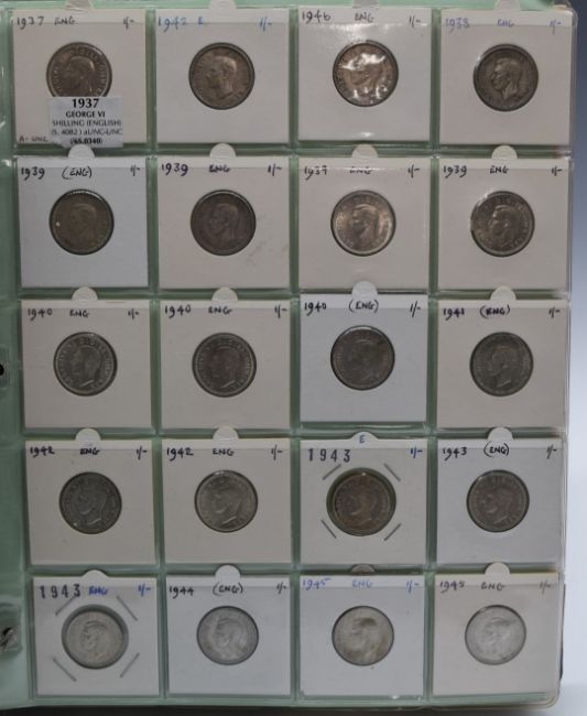 A large collection of English shillings, includes Queen Anne example, George III, George IV, young Victoria, Jubilee head Victoria, veiled head, Edward VII, George V, George VI, Elizabeth II, silver content, all contained in an album