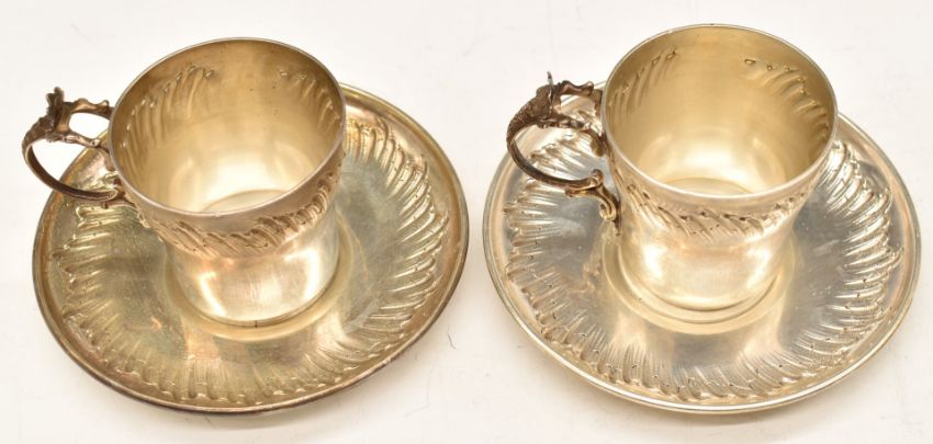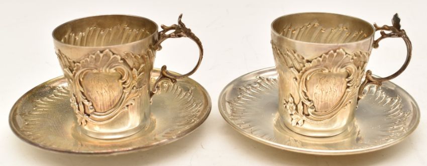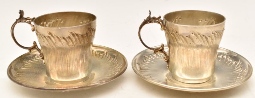 Pair of late 19thC French silver cups and saucers with embossed decoration, French silver marks for Henri Soufflot, diameter of saucers 11.5cm, weight 315g