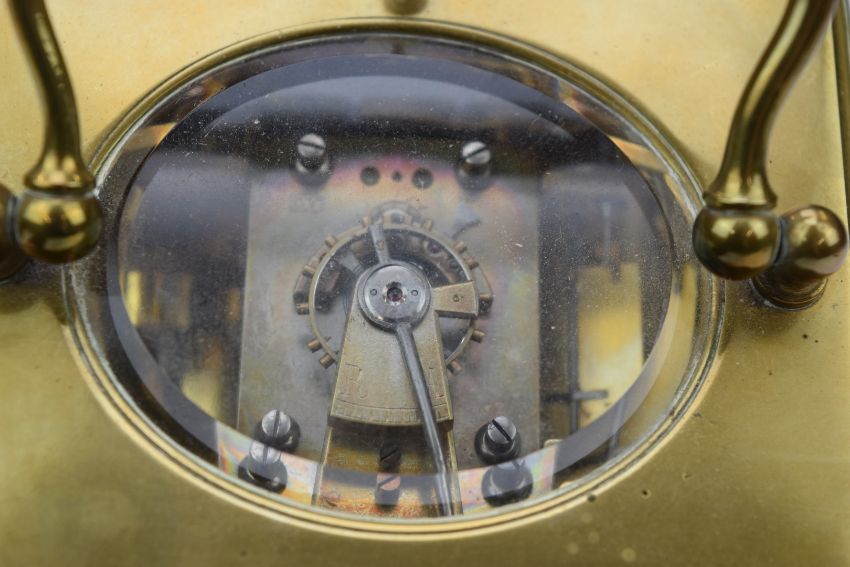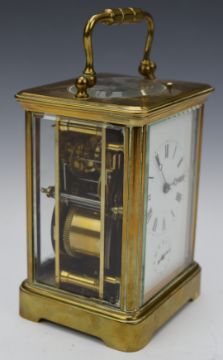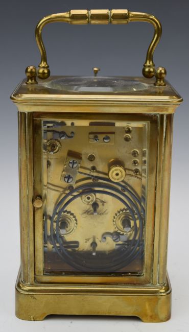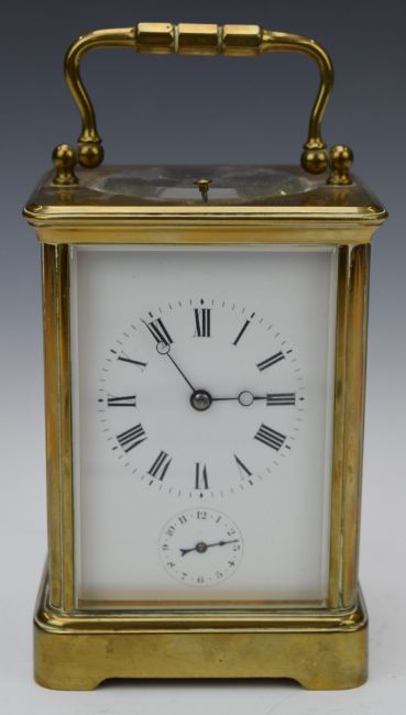 Brass cased repeating carriage clock with subsidiary alarm dial, H17cm
