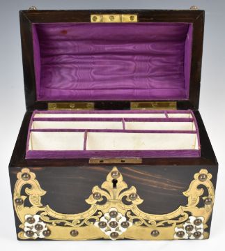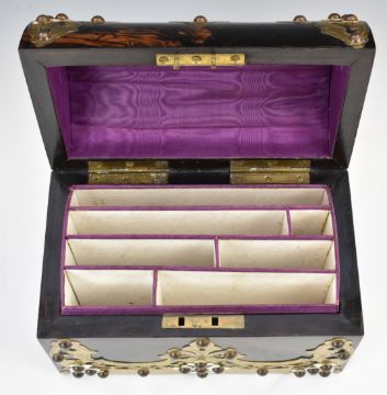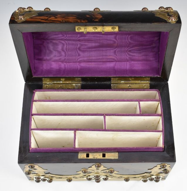Victorian brass overlaid domed coromandel stationery box/casket with fitted interior, W19 x D11 x H14cm