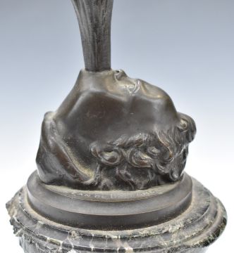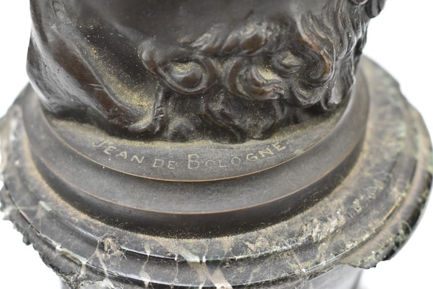 After Jean De Bologne, bronze study of Mercury on a Zephyr wind raised on a marble plinth with bronze frieze of classical scenes, impressed Jean De Bologne, H70cm