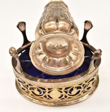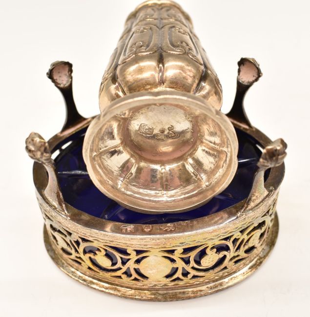 Pair of Georgian hallmarked silver open salts with pierced decoration and blue glass liners, London 1817, maker's mark rubbed, together with a pair of Georgian hallmarked silver peppers, engraved 'kyan' and 'salt', marks indistinct but possibly London 1796, height 9cm, weight of all items without liners 257g