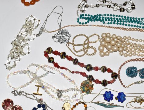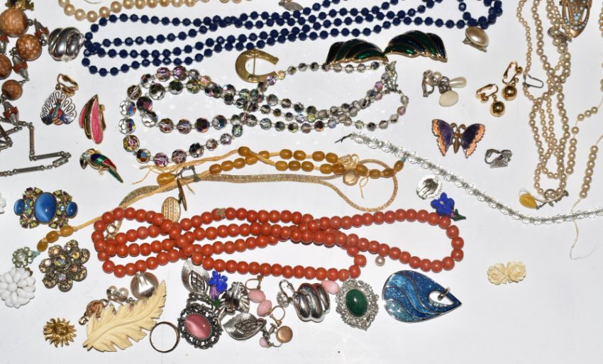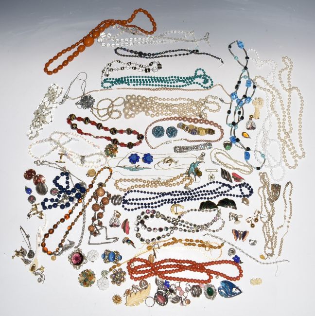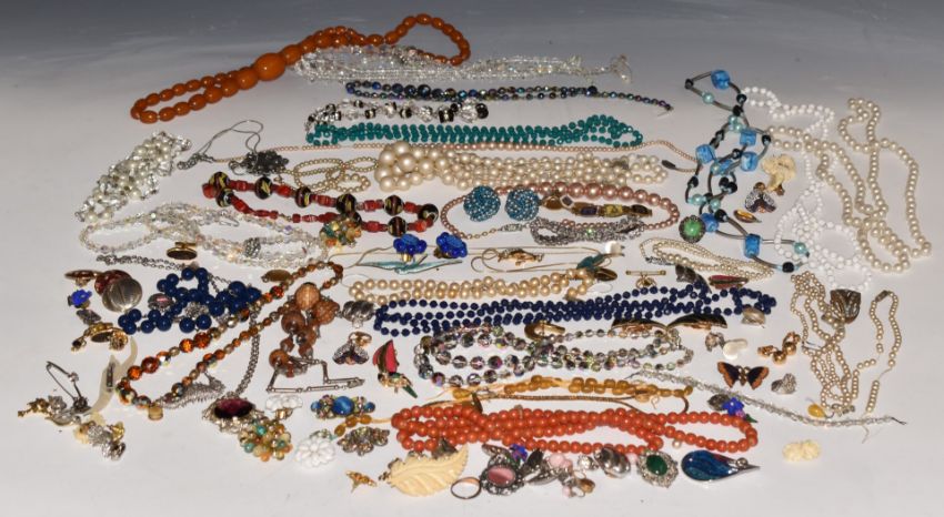 A collection of beaded necklaces and vintage earrings including Coro, Art Deco beads, diamanté bracelet, Bakelite necklace, etc