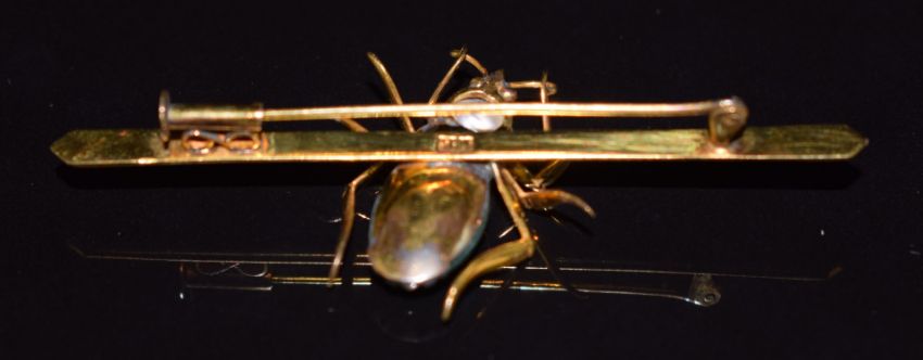 Chinese 18k gold brooch in the form of a spider set with a jade cabochon and a pearl, 4.4g, 5.6cm