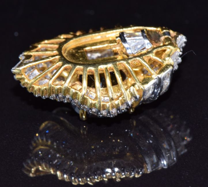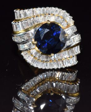 An 18ct gold metamorphic ring / pendant set with a round cut sapphire of approximately 2.2ct surrounded by baguette cut diamonds, size O, 16.6g