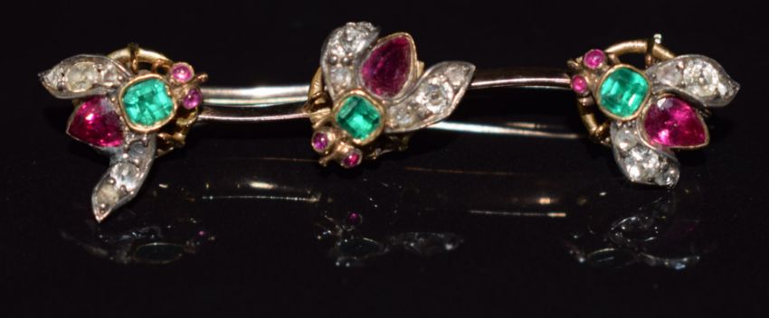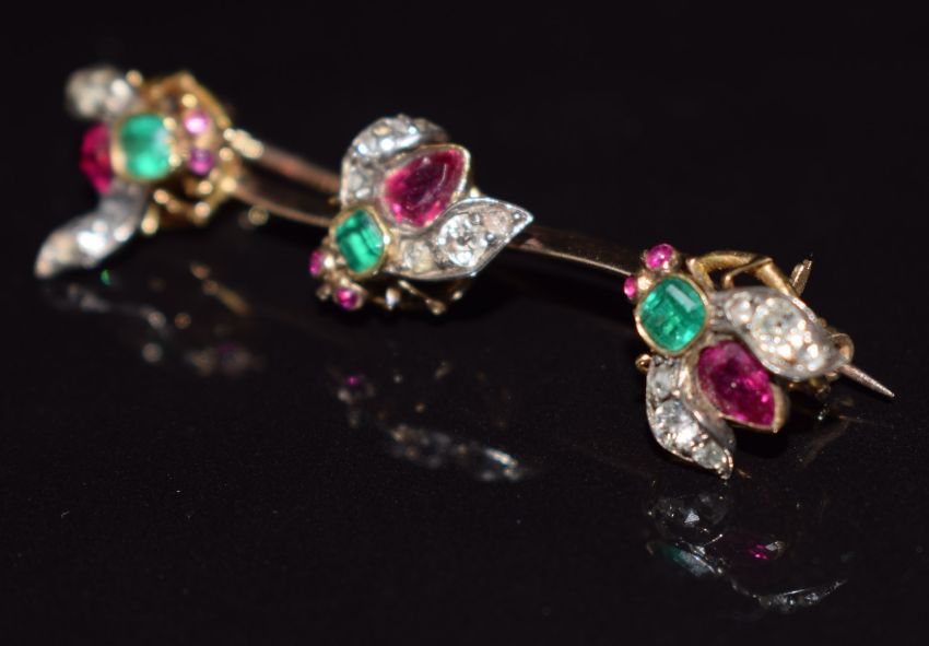 Victorian brooch in the form of three insects/ flies set with rubies, emeralds, old and rose cut diamonds, 5.7g, 4.5cm