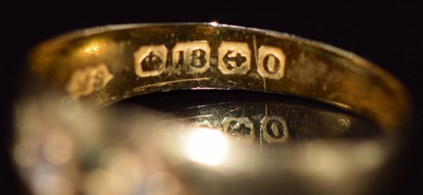 An 18ct gold ring set with three diamonds in star settings, Birmingham 1913, 2.8g, size M