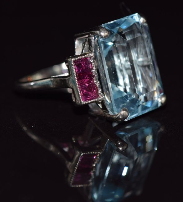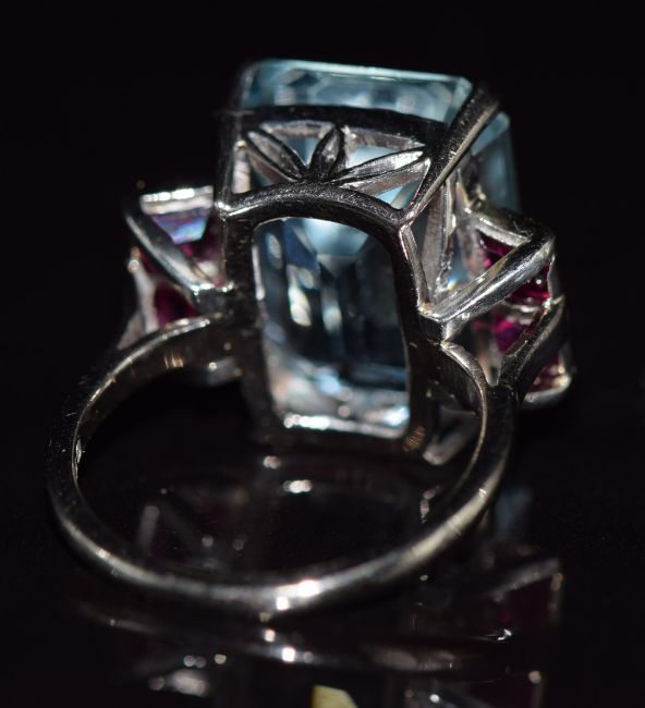 An 18ct white gold ring set with an emerald cut aquamarine of approximately 10.8cts and four square cut rubies, 7.2g, size I/J